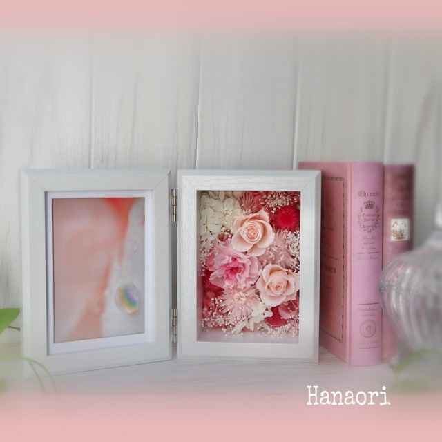 フォトフレームS ビビアンピンク 小さなベビーピンクのバラにミニカーネーションを入れてかすみ草など小花を詰め込んで 淡くかわいいアレンジに仕上げています。 母の日には感謝を伝える贈り物、その他お祝いのお花にもお使いいただけますが お供えのメモリアルフラワーにも使っていただけます。 立てかけると縦の写真、置くタイプにすると横向きの写真を入れて飾っていただけます。 材質:MDF(紙張り)、ガラス面(写真、アレンジ部分) サイズ:●オープン時:22.3x14.6x奥行6cm ●クローズ時:11x14.6x奥行7.7cm (アレンジ面内寸:8.1x11.9x5cm) ※母の日 ギフトなど、送り先が別になる場合の設定は 注文を進めて行くと送り先を記入する欄が出てきます。そちらへ記入してください。