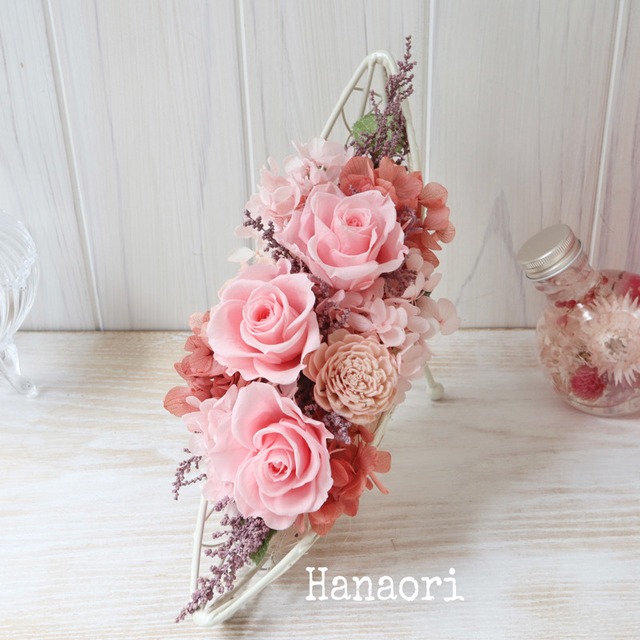 甘いピンクを中心にエンジの小花を添えたプリザーブドフラワーのアレンジです。足元のスタンドを立てれば、たてに飾る事もできます。 サイズ:たて約10cmxよこ約25cmxおく約12cm ※ラッピングはオプションから選択して下さい。 ギフトなど、送り先が別になる場合の設定は 注文を進めて行くと送り先を記入する欄が出てきます。そちらへ記入してください。