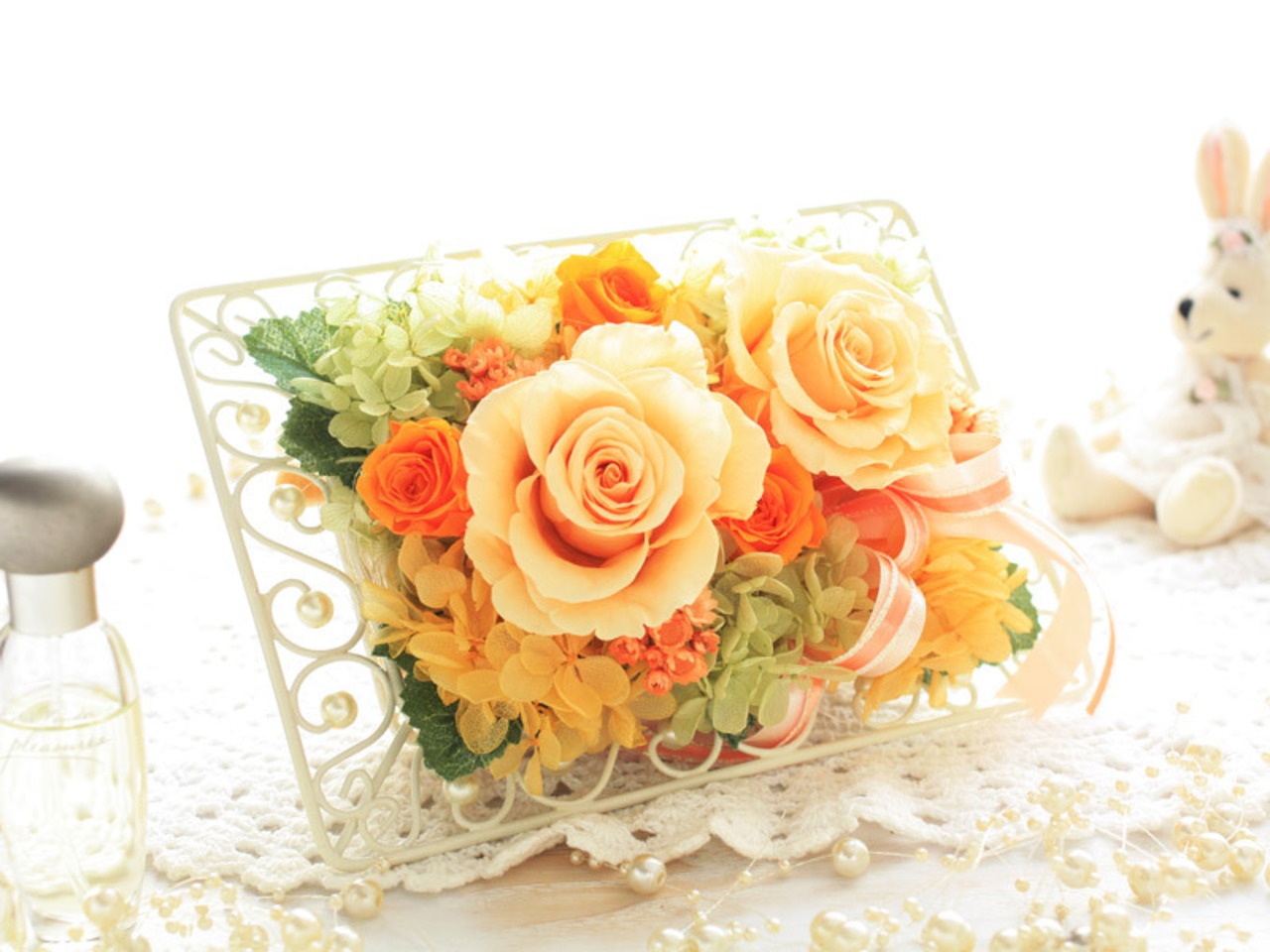 人気で定番のパールビーズアイアンシリーズのお花をグレードアップした華やかなアレンジです。