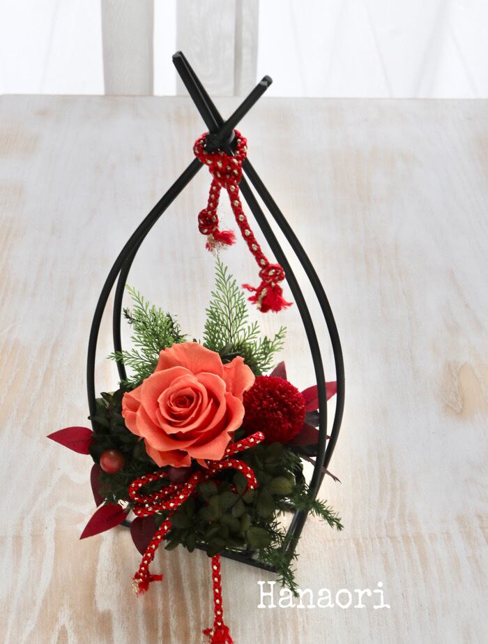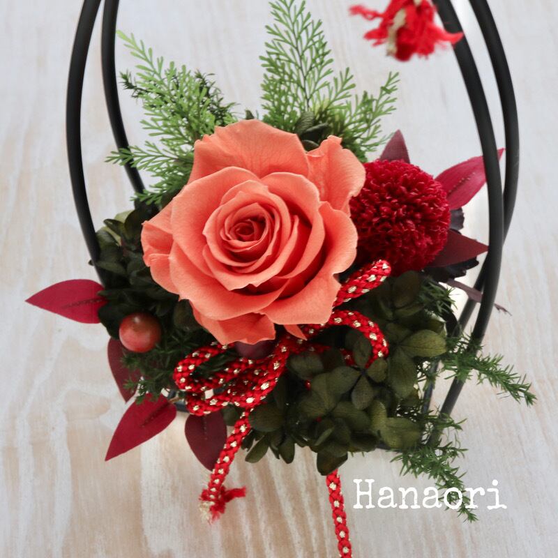 深紅のピンポンマムと赤い実でまとめ、華やかな赤紐で明るく仕上げました。