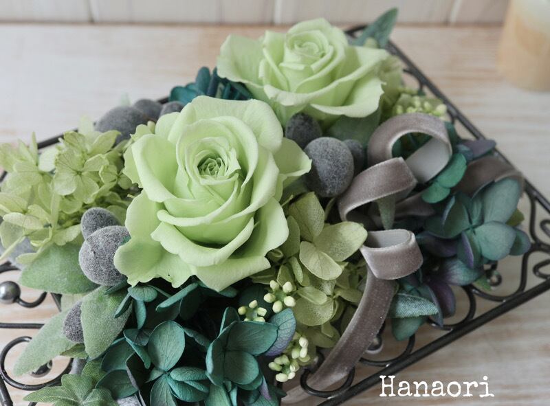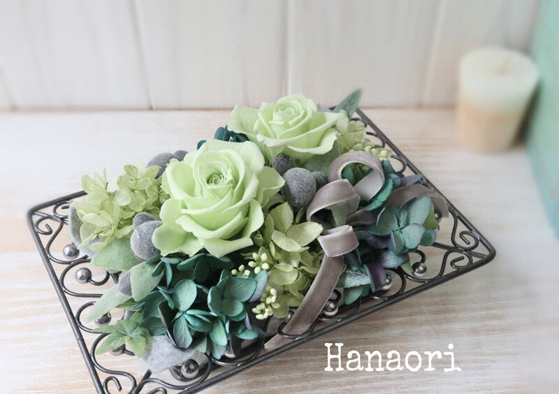 人気のパールビーズ付の額形アレンジのグリーンです。爽やかなグリーンでまとめた季節に合ったプリザーブドフラワーアレンジです。
