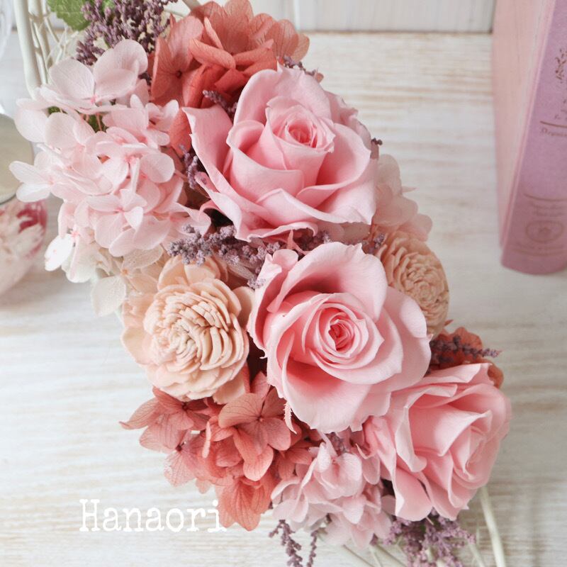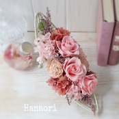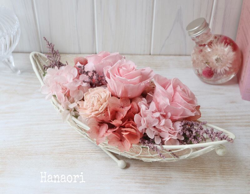 甘いピンクを中心にエンジの小花を添えたプリザーブドフラワーのアレンジです。足元のスタンドを立てれば、たてに飾る事もできます。