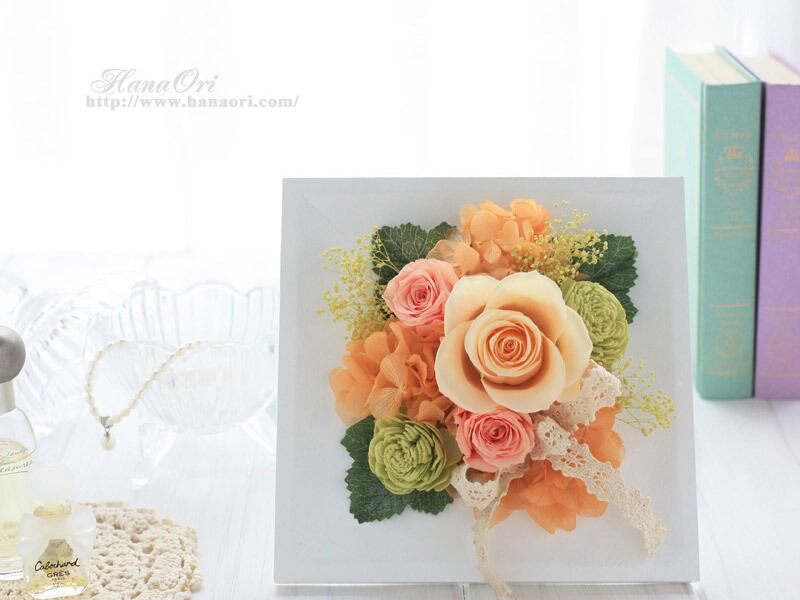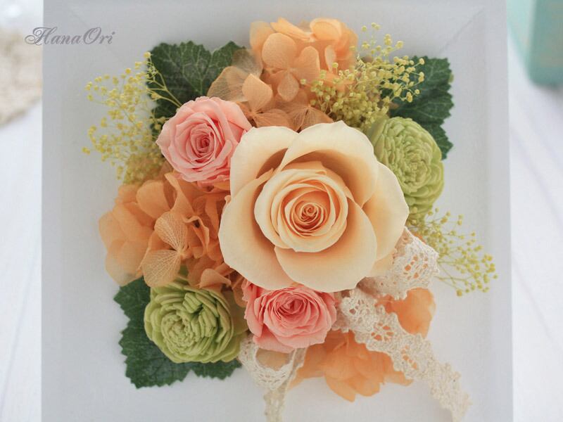 オレンジのバラに甘いピーチオレンジの小バラ・オレンジのあじさいを合わせ、かわいらしく仕上げました。※額は立て掛けたり壁に掛けたり出来るアレンジです。