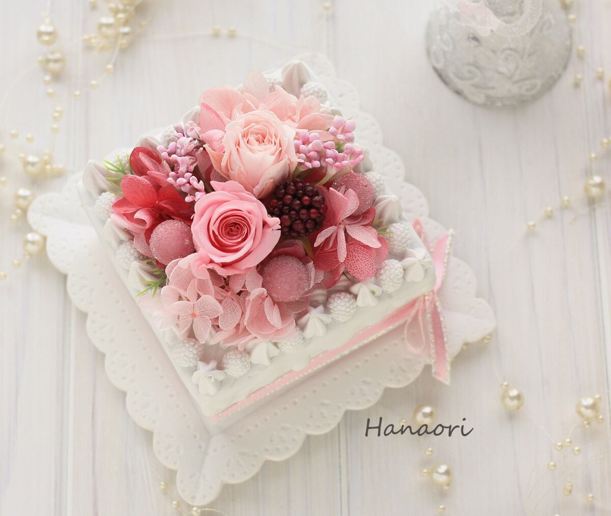 器のホイップが本物のケーキのよう。ピンク濃淡のバラに赤いベリーが入ったキュートなアレンジです。