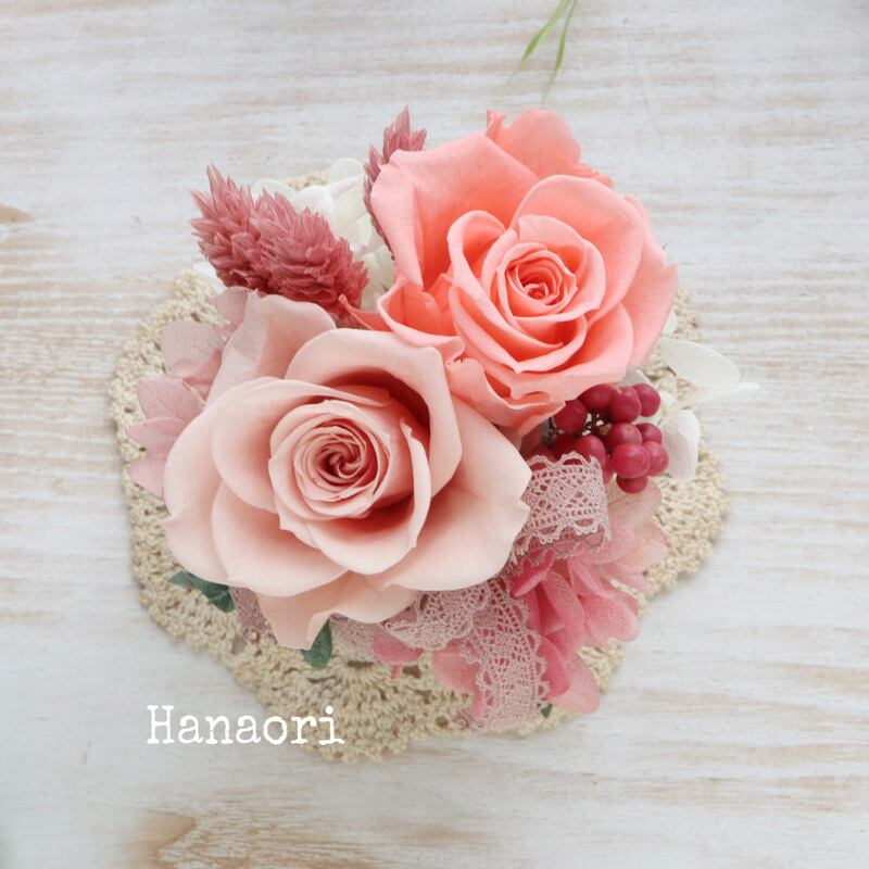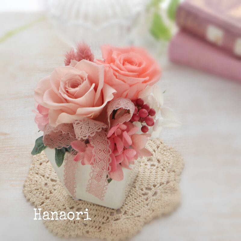 柔らかなバニラピンクのバラと淡いピーチオレンジのバラ・小花を入れて上品にまとめたアレンジです。