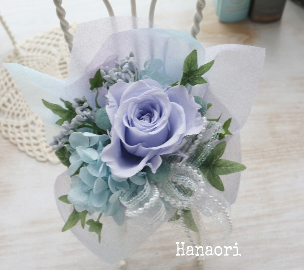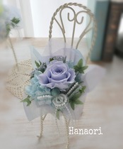 小さな白いチェアーがかわいらしいプリザーブドフラワーアレンジです。明るく爽やかなパープル系のブルーのバラが華やかな、人気の色あいのアレンジです。