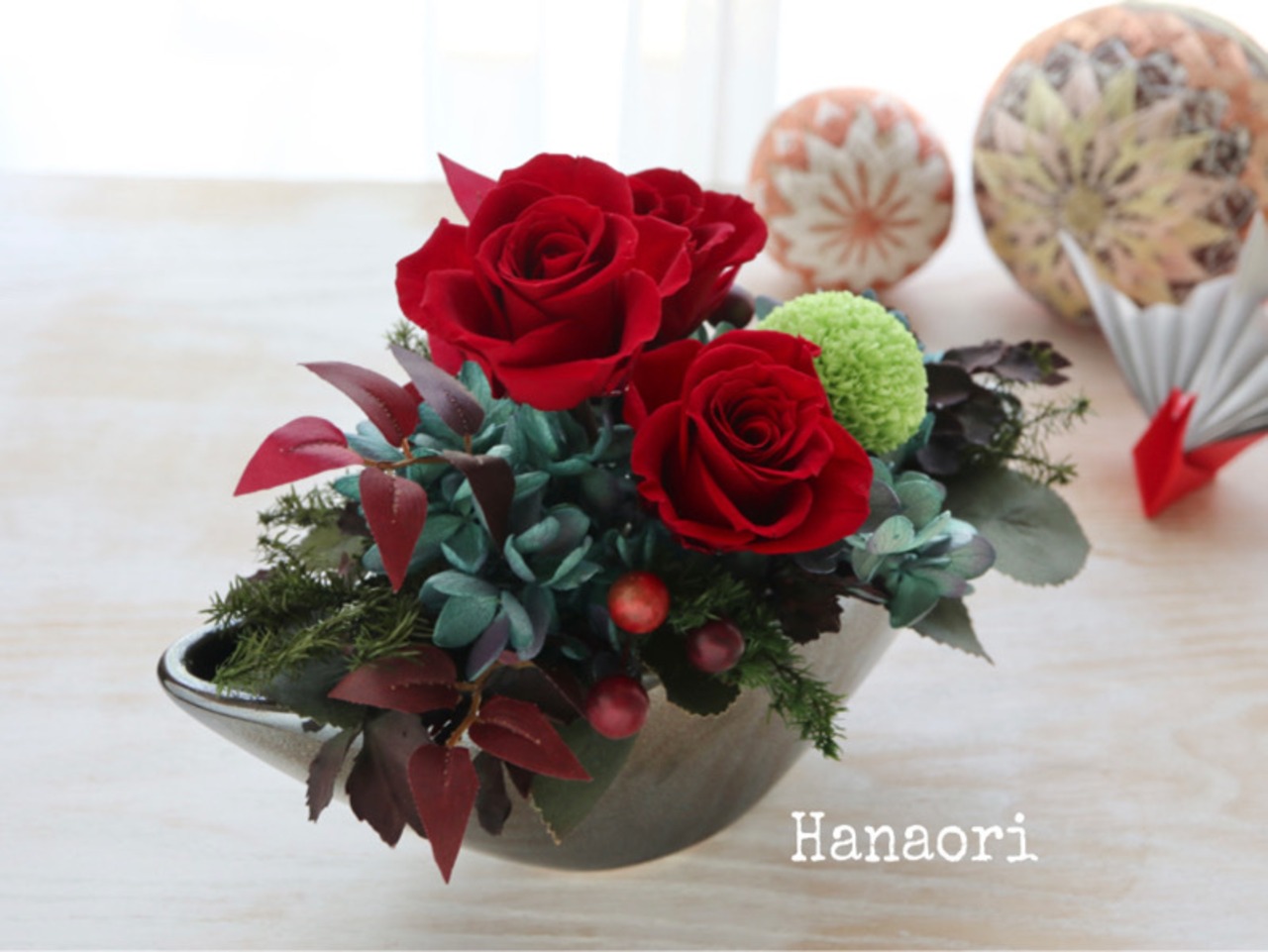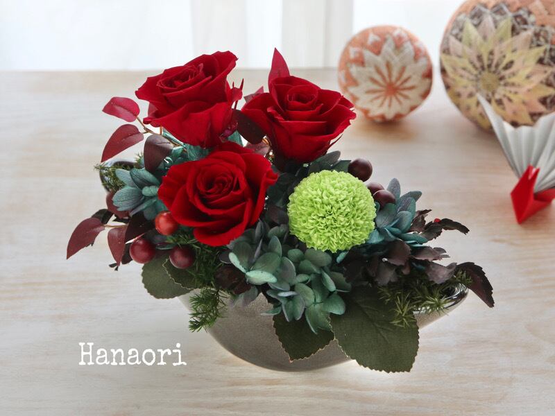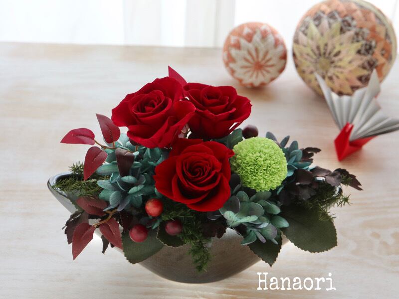 深紅のバラを主に、グリーンのピンポンマムを入れた和風のアレンジです。渋さの中にも華やかさのあるアレンジはお祝い花としてもおすすめの商品です。