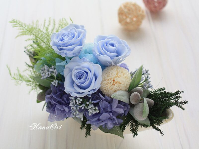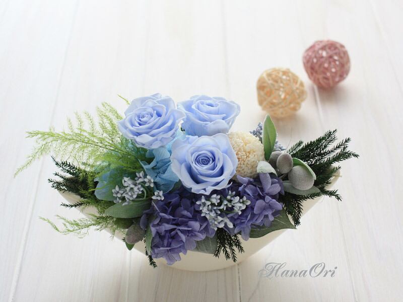 白いシャープな横長のベースに、ブルー系の花たちをまとめたアレンジです。人気のピンポンマムと明るく華やかなブルーのバラを入れたアレンジは、ブルー系の好きな方に、特にお薦めです。