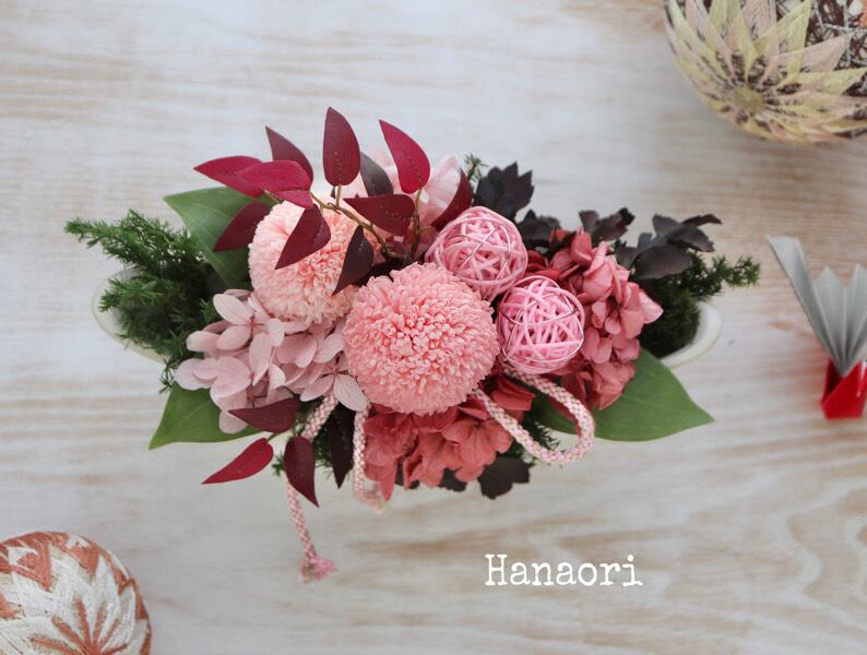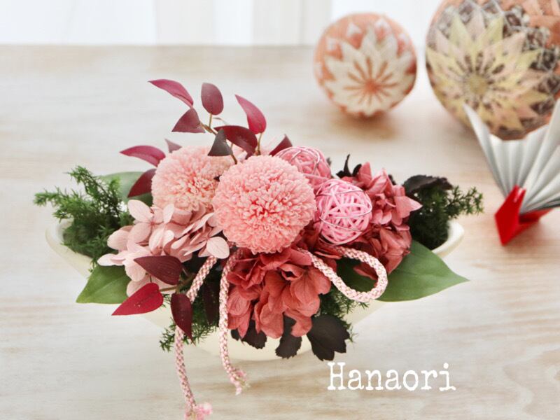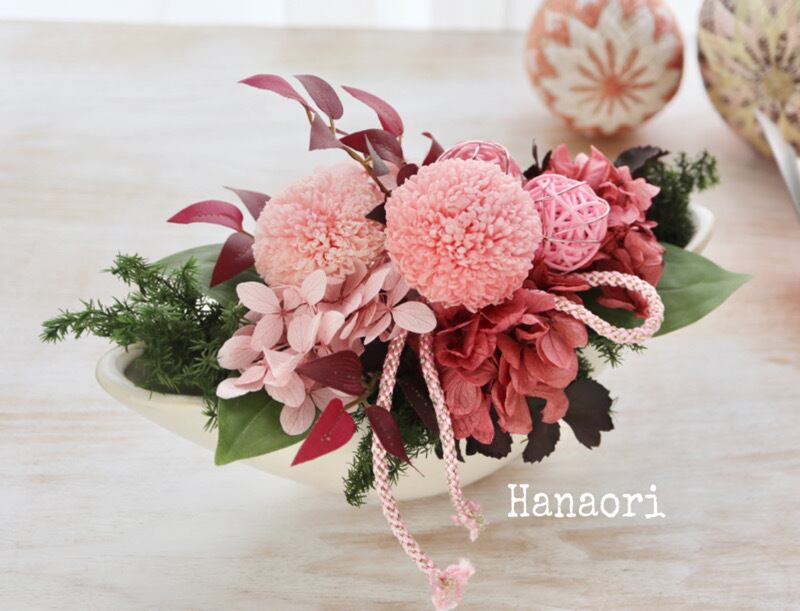 白い横長のベースに淡いピンクのピンポンマムと手毬のような玉が入ったプリザーブドフラワーアレンジです。ゴールドの入った紐もかわいらしいアレンジです。