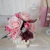 ピンクバラに濃いピンクミニバラを入れワイン系の小花をクラッシックな器にアレンジしました。
