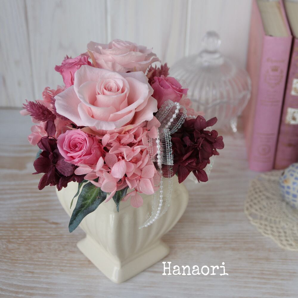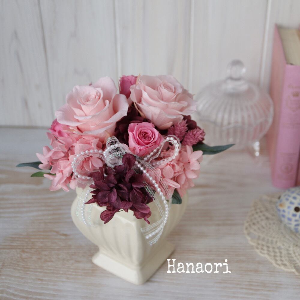 ピンクですがワイン系と合わせたことで大人っぽい仕上がりのアレンジです。