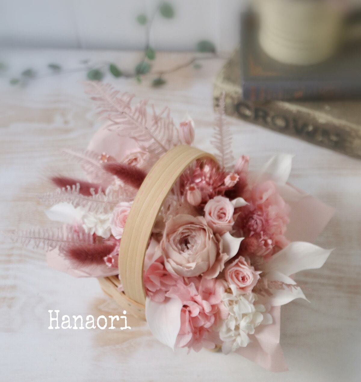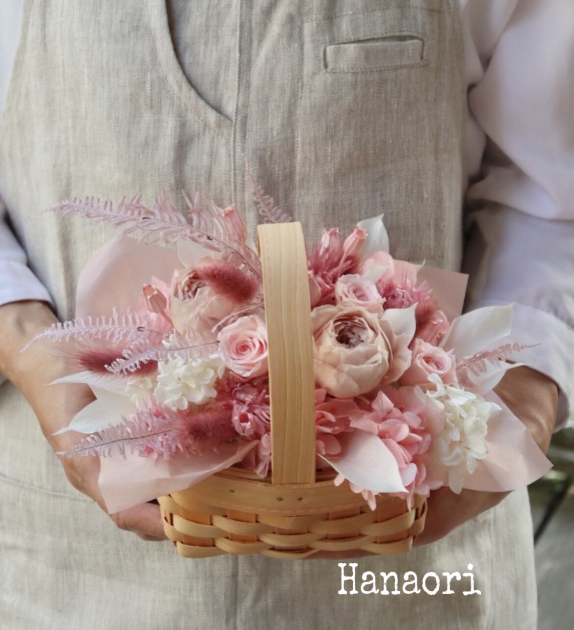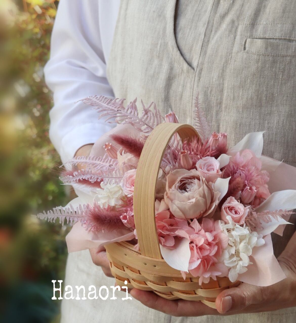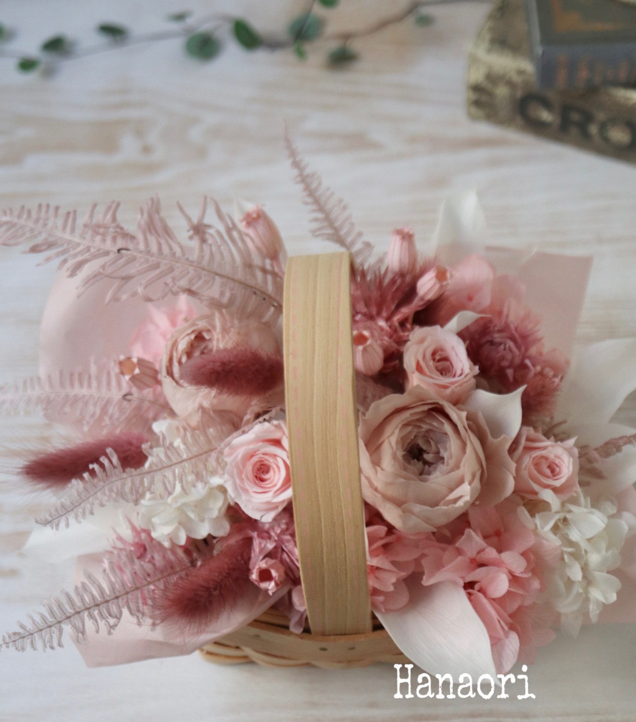 持ち手にステッチの入った可愛いバスケットに淡いコロンと丸いピンクベージュのバラ、ベビーピンクミニバラ、くすみピンクなどの小花など入れてふんわりさせたアレンジです。