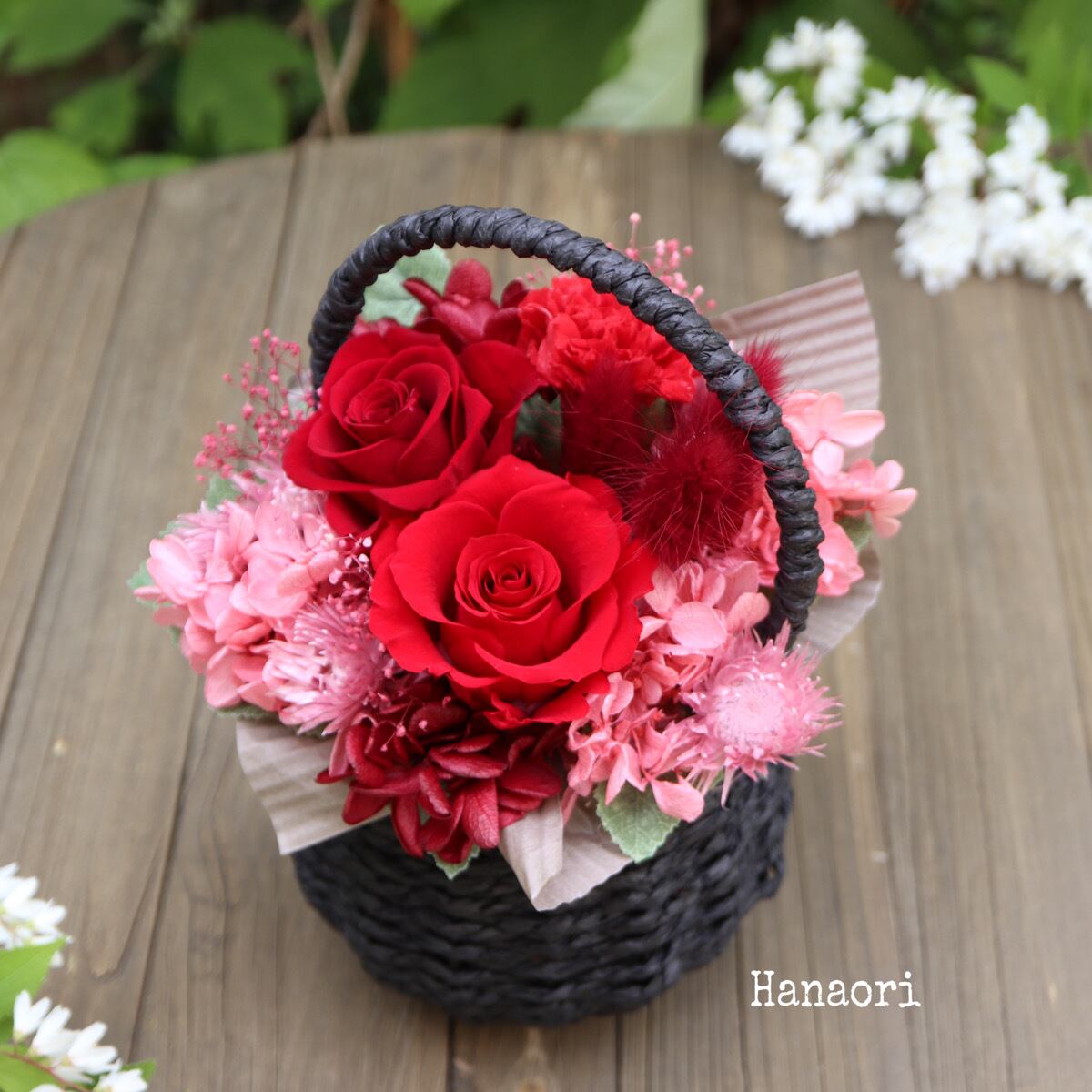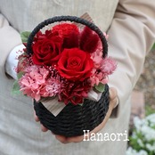 真紅バラと赤いバラ、赤いカーネーションなどを入れて大人っぽく仕上げたアレンジ、黒くてもかごが丸い為、可愛らしさと大人っぽさのあるアレンジです。