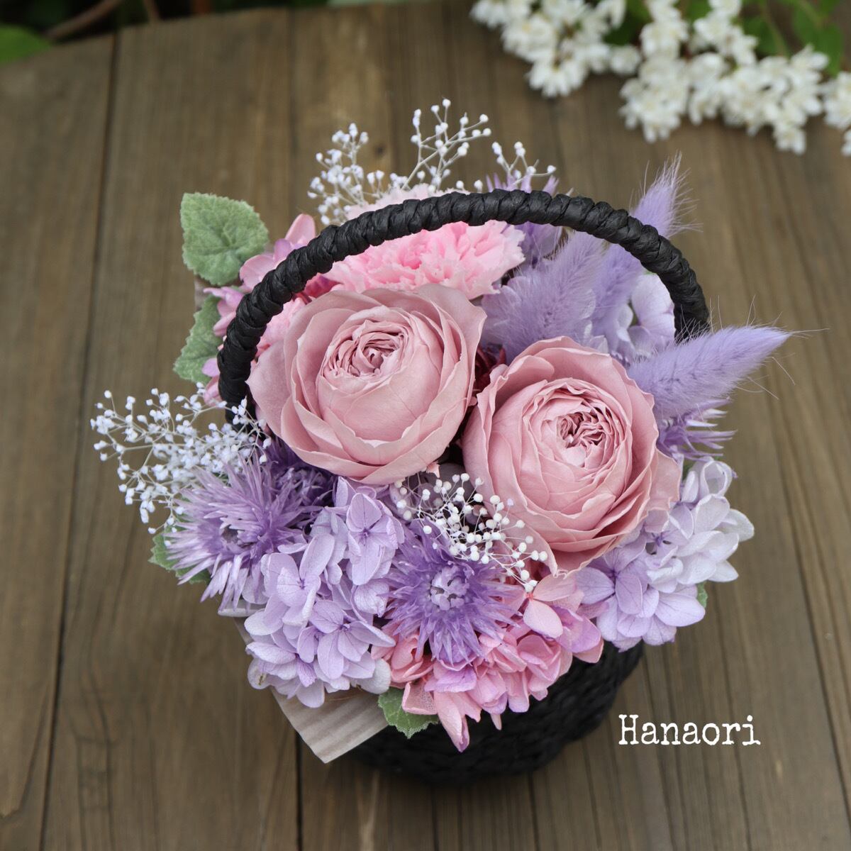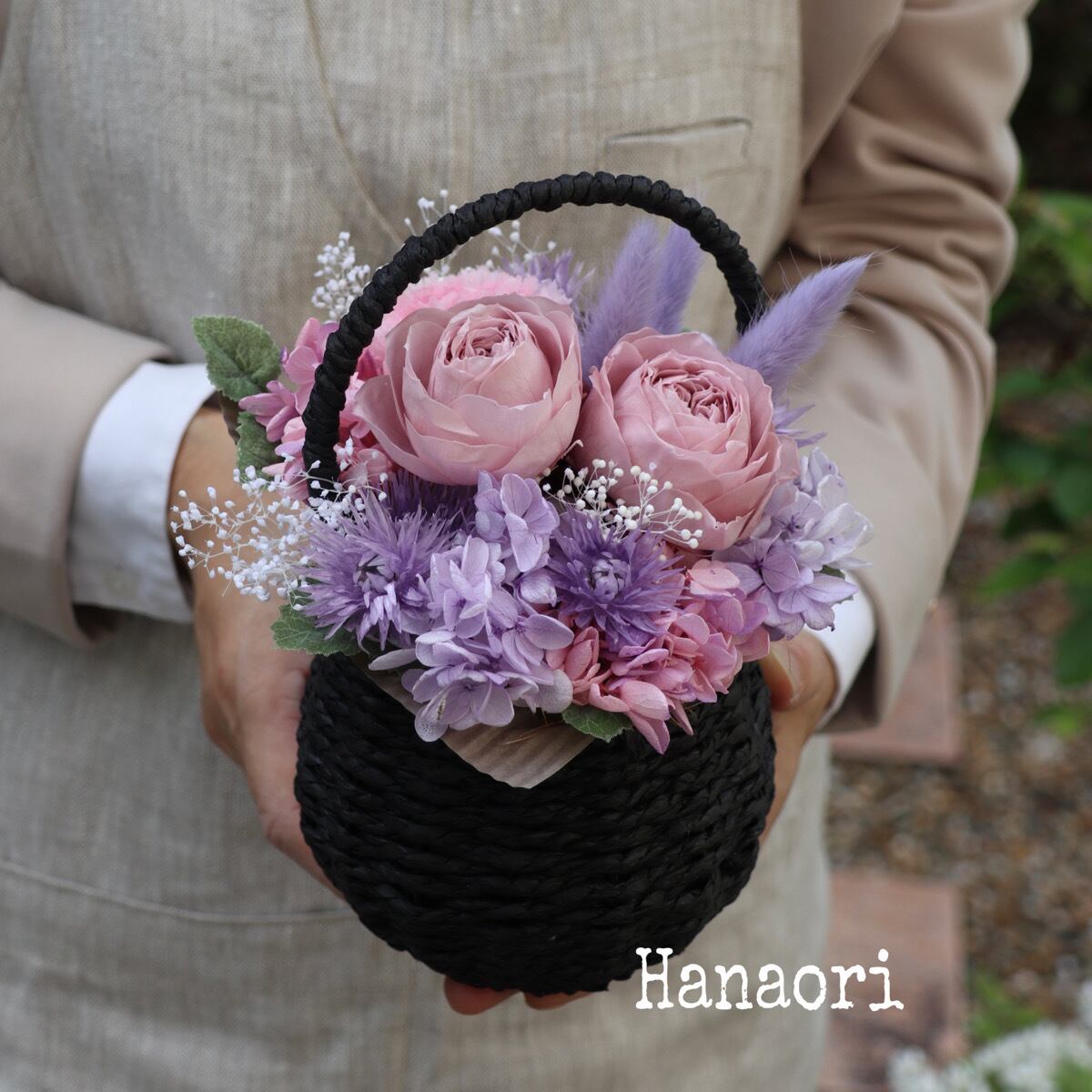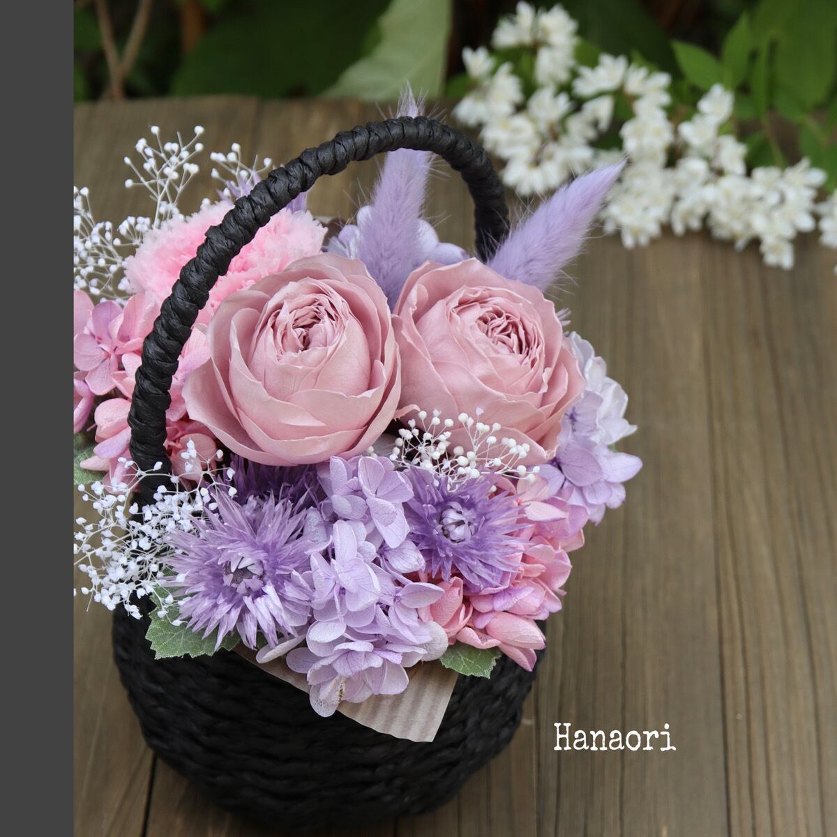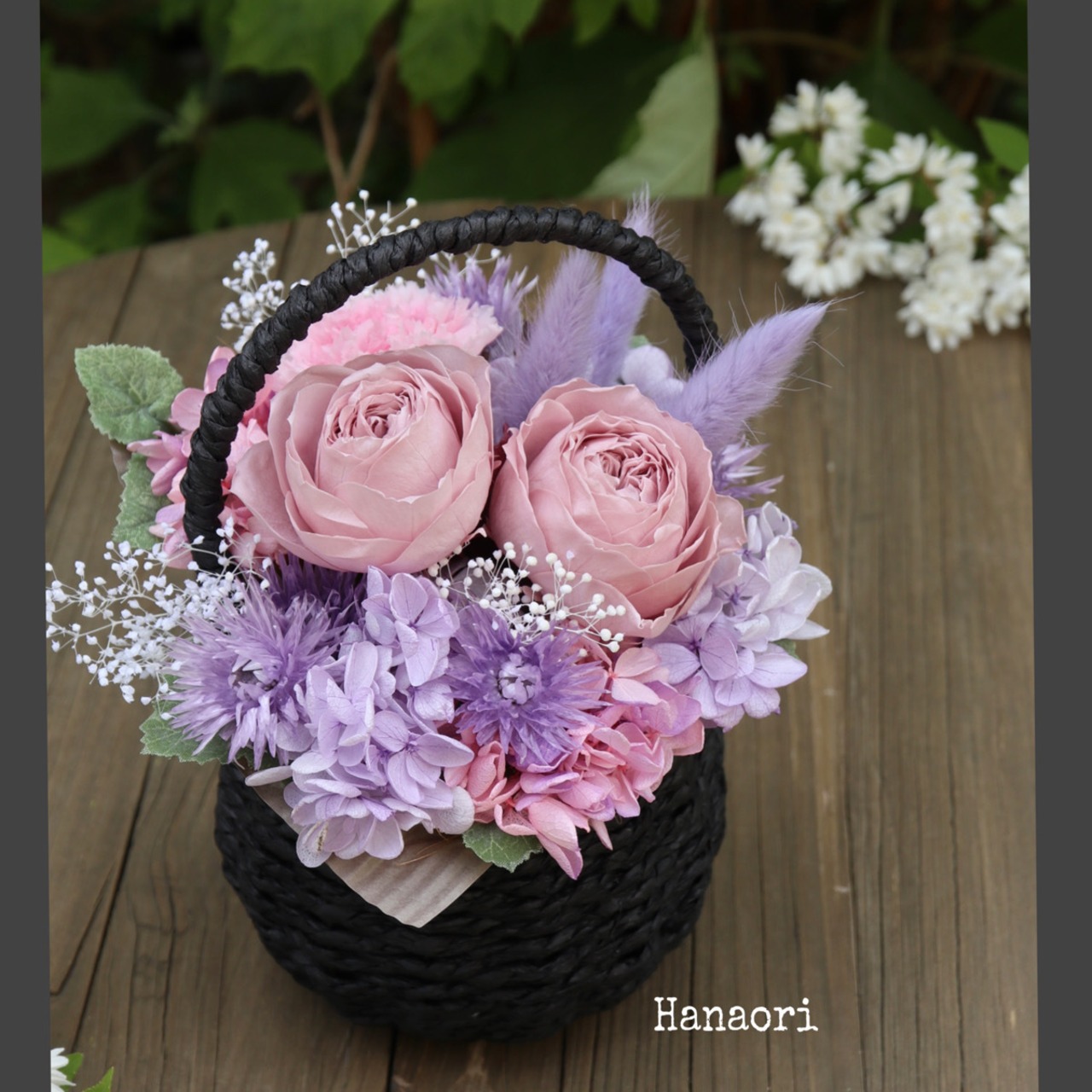 くすみのあるパープルピンクの丸咲のバラと淡いピンクなどを入れて大人っぽく仕上げたアレンジ、黒くてもかごが丸い為、可愛らしさと大人っぽさのあるアレンジです。