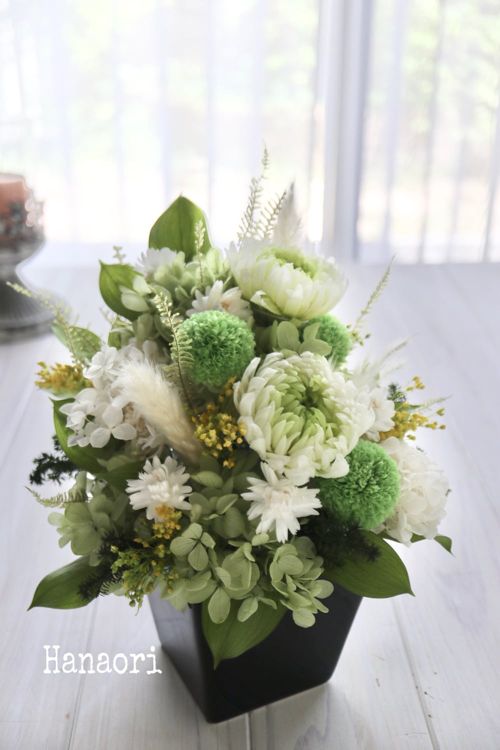 清楚なお供えアレンジ「彩 グリーン」黒い器にグリーンと白を基調とした、プリザーブドフラワーの上品な緑色のお供えです。